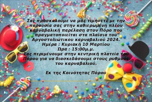 Σας προσκαλούμε όλους, στην κεντρική πλατεία του πόρου την Κυριακή 10 Μαρτίου 2024, για να διασκεδάσουμε, να γιορτάσουμε και να γλεντήσουμε παρέα στη μεγάλη αυτή γιορτή. Η παρέλαση θα ξεκινήσει στις στις 3 το μεσημέρι με άρματα, καρναβαλιστές, μασκότ, ξυλοπόδαρους και θα ολοκληρωθεί με καλλιτεχνικό πρόγραμμα, για να βιώσουμε όλοι μαζί, τη χαρά και το γέλιο που φέρνει μαζί του το καρναβάλι.