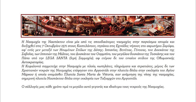 Σας προσκαλούμε την Τετάρτη 7 Οκτωβρίου 2020 στίς 10 το πρωί στην εκκλησία των Ταξιαρχών Αργοστολιου ( Santa Maria de Vittoria ) για να τιμήσουμε τους πεσόντες στην Ναυμαχία της Ναυπάκτου.