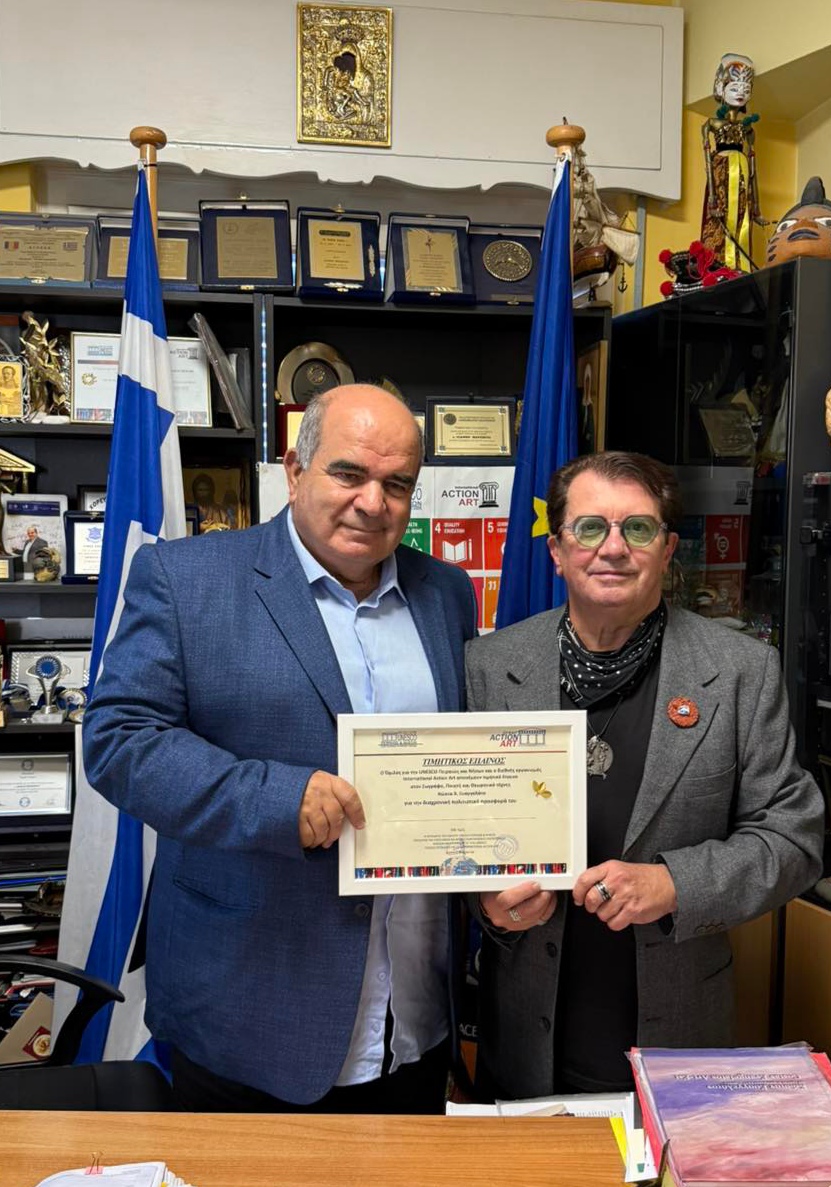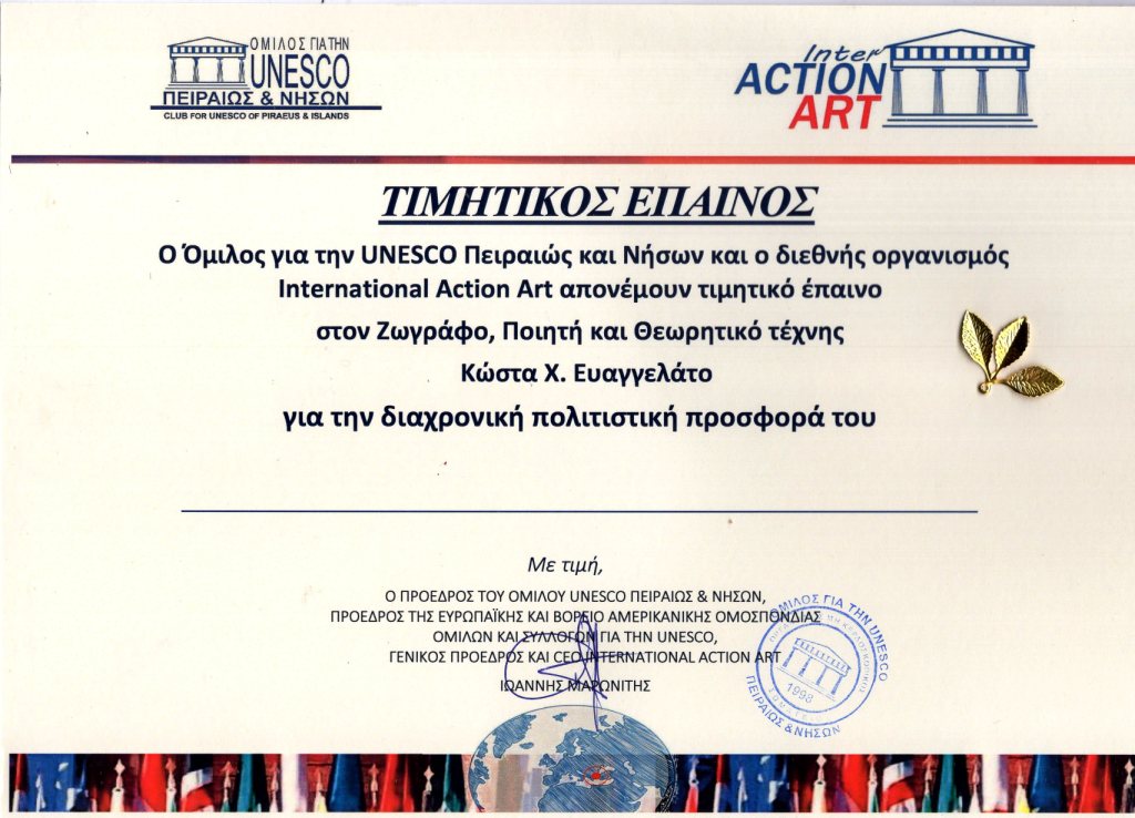 Παρέλαβε, την ημέρα των γενεθλίων του, τιμητικό έπαινο για το σύνολο της καλλιτεχνικής του προσφοράς από τον κ. Ιωάννη Μαρωνίτη, πρόεδρο των Ομίλων για την Unesco της Ευρώπης και της Βόρειας Αμερικής και πρόεδρο της International Action Art, του Ομίλου για την Unesco Πειραιώς και Νήσων. Στην απονομή που έγινε στα γραφεία της Unesco στην Νίκαια, ο τιμώμενος ευχαρίστησε για την αιγίδα της Unesco στη θερινή, επετειακή έκθεση του στη Σύγχρονη Πινακοθήκη Villa Ροδόπη στο Αργοστόλι, και την αγαστή διαχρονική συνεργασία τους σε διεθνείς εικαστικές εκθέσεις, εκδηλώσεις και βραβεύσεις, και κύρια για την συμμετοχή του με ζωγραφικά έργα του στο κεντρικό κτίριο της Unesco στο Παρίσι.
