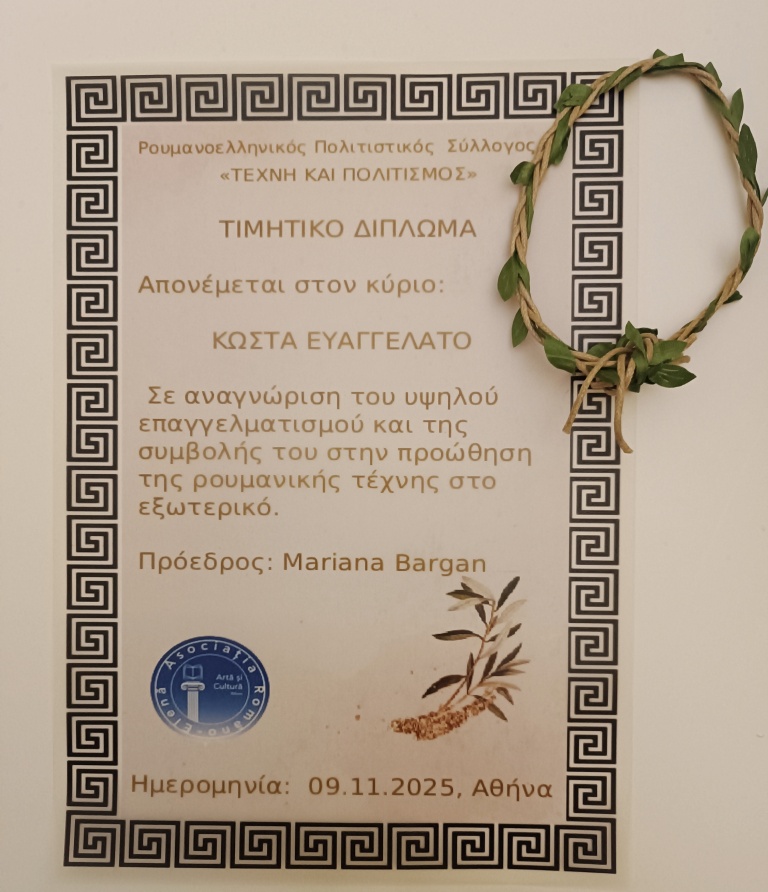 Έλαβε για την συμμετοχή του στα Δρώμενα Τέχνης, ως τιμώμενος καλλιτέχνης, έπαινο από την κ. Ρούλα Pappas- Τσιώτα, εικαστικό-εκπαιδευτικό, επιμελήτρια των εκδηλώσεων στον Ελληνογαλλικό Σύνδεσμο Αθηνών. Στην εικαστική έκθεση με τίτλο: «Στιγμές έμπνευσης στον κύκλο της ζωής» συμμετείχε με την ζωγραφική σύνθεση του «Το χορικό του επαναπατρισμού». Του απονεμήθηκε επίσης τιμητικό δίπλωμα και συμβολικό στεφάνι ελιάς από την κ. Marianna Barkan, Πρόεδρο του Ρουμανοελληνικού Πολιτιστικού Συλλόγου «Τέχνη και Πολιτισμός», μετά την θεωρητική, κριτική του προσέγγιση στα εγκαίνια της έκθεσης του Ρουμάνου καλλιτέχνη Petre Grigorin , με τίτλο «Μεταμόρφωση». Η έκθεση του διακριμένου ζωγράφου πραγματοποιήθηκε με επιτυχία στον Ελληνογαλλικό Σύνδεσμο Αθηνών.
