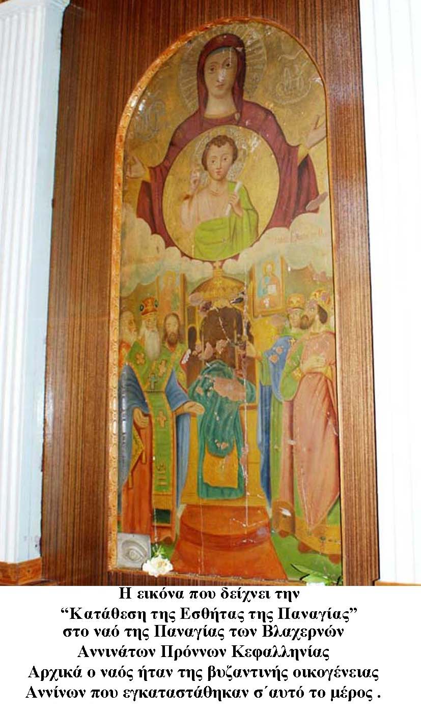 Η μοναδική εικόνα στην Κεφαλονιά που εικονίζει το θέμα της εορτής, δηλαδή τη φανέρωση της Εσθήτας και την τοποθέτησή της στο ναό της Παναγίας των Βλαχερνών, είναι στην ομώνυμη εκκλησία στα Αννινάτα Πρόννων. Είναι τοποθετημένη στο εικονοστάσι του ναού, ενώ για προσκύνημα βγάζουν μια εικόνα της Παναγίας.