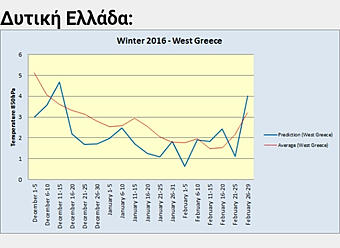 Χαρακτηριστικό της βαρυχειμωνιάς θα είναι οι πολύ χαμηλές θερμοκρασίες σε όλη τη χώρα (τουλάχιστον κατά 2-3 βαθμούς χαμηλότερη από τα φυσιολογικά επίπεδα όπως φαίνεται και στο γράφημα για τη Δυτική Ελλάδα που δημοσίευσε πρόσφατα το www.youweather.com) οι έντονες χιονοπτώσεις στα ορεινά και ημιορεινά τμήματα, κυρίως της βόρειας Ελλάδας και οι πολύ ισχυρές καταιγίδες στη νότια Ελλάδα και στα δυτικά, συμπεριλαμβανομένου του Ιονίου.