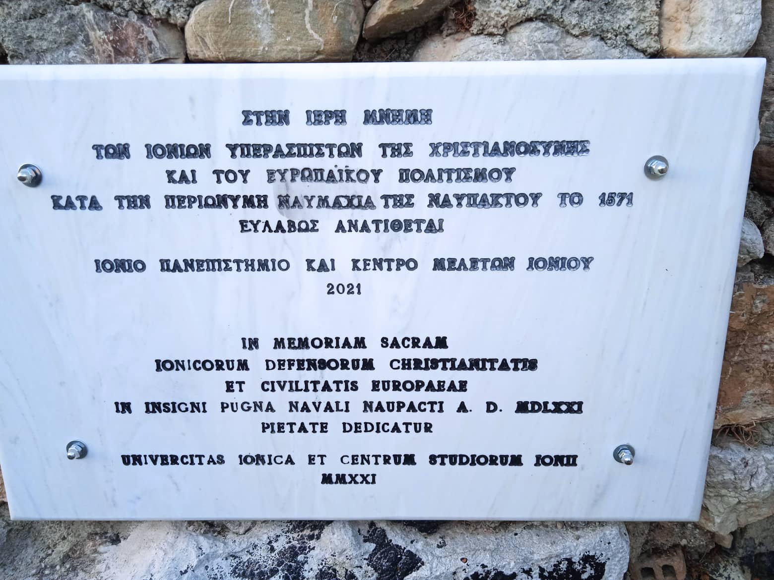 Η πινακίδα συντάχθηκε στην ελληνική και λατινική και διαμορφώθηκε με την συνεργασία του Ιονίου Πανεπιστημίου και του Κέντρου Μελετών Ιονίου. Η σχετική πρωτοβουλία συμφωνήθηκε μεταξύ των δύο φορέων ήδη από το 2021 και η ακριβής χωροθέτηση και τοποθέτηση διαμορφώθηκαν με την σύμφωνη γνώμη του Δήμου Ναυπακτίας και της Εφορείας Αρχαιοτήτων Αιτωλοακαρνανίας και Λευκάδας.