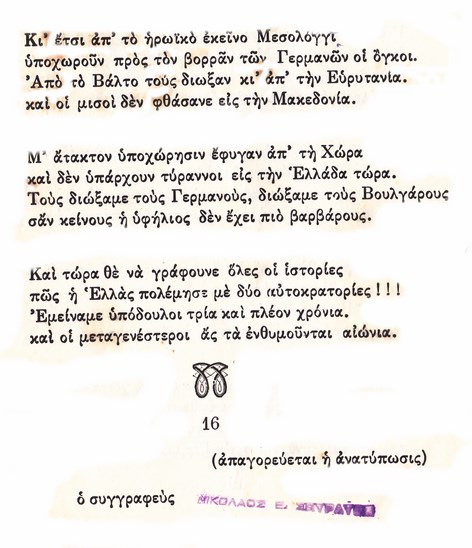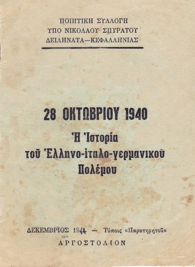 Σας φανερώνω το μεγάλο ποίημα για το 1940 που έγραψε ο Νικόλαος Σπυράτος από τα Δειληνάτα το Δεκέμβριο του 1944 (Τύποις- Παρατηρητού-) Αργοστόλιον.