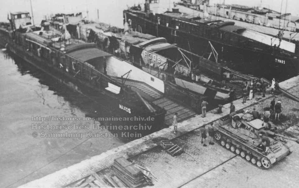 Σύμφωνα με την Σύμβαση για το καθεστώς των Στενών του 1936 (Σύμβαση του Μοντρέ, Montreux – Convention Regarding the Regime of the Straits), η διέλευση αυτών από πολεμικά πλοία που δεν ανήκουν σε κράτη της Μαύρης Θάλασσας είναι περιορισμένη σημαντικά, ενώ στον Β’Π.Π. έως τον Φεβρουάριο του 1945 η Τουρκία ήταν ουδέτερη και είχε διακόψει την κυκλοφορία για τα πλοία των εμπολέμων. Επομένως τα γερμανικά πλοία έπρεπε να «μεταμφιεστούν» σε πολιτικά. Έτσι αφαιρέθηκε ο οπλισμός και τους δόθηκαν ονόματα ελληνικών νησιών σαν να ήταν πλοία ακτοπλοϊκών μεταφορών, όπως “Tynos”(F494), “Paros” (F496), “Andros” (F497) κτλ. και το “F495” προσωρινά βαφτίστηκε “Naxos” τον Ιούνιο του 1943, άλλωστε η ίδια η ονομασία του τύπου (Marinefährprahm) μεταφράζεται σε «φορτηγίδα πορθμείου», ενδεχομένως εν μέρει για να εξυπηρετηθεί αυτός ο στόχος της «κάλυψης» του πραγματικού σκοπού χρήσης τους σε πολεμικές επιχειρήσεις. Στις 12 Ιουνίου μετέβη στην Κοστάνζα (Constanta, Ρουμανία) ενώ ένα μήνα μετά στις 12 Ιουλίου, βρισκόταν στον Στολίσκο Παράκτιας Άμυνας Αττικής με έδρα τον Πειραιά.