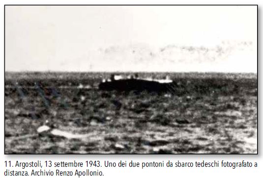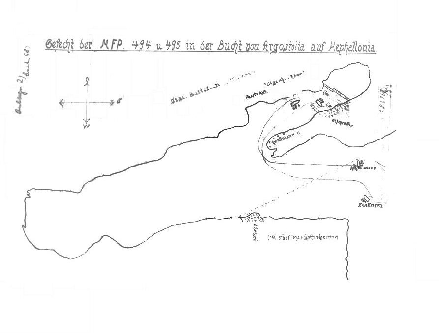 Στο γερμανικό Ημερολόγιο Ναυτικής Διοίκησης (Kriegstagebuch der Seekriegsleitung 1939-1945 – Teil A ; Band 49. September 1943) αναφέρεται ότι: «Στις 13 Σεπτεμβρίου 1943 στις 07:00, ιταλικές πυροβολαρχίες άνοιξαν πυρ κατά δύο δικών μας αποβατικών σκαφών (τα “F494” και “F495”τύπου “MFP”) που προσέγγιζαν στο Αργοστόλι μεταφέροντας δύο πυροβολαρχίες των 150 χιλ., το ένα από τα δύο σκάφη βυθίστηκε (χωρίς απώλειες), το άλλο ρυμουλκήθηκε στο Ληξούρι  με νεκρούς (4 σε αριθμό) και τραυματίες (7 σε αριθμό) επιβαίνοντες σε αυτό.»
