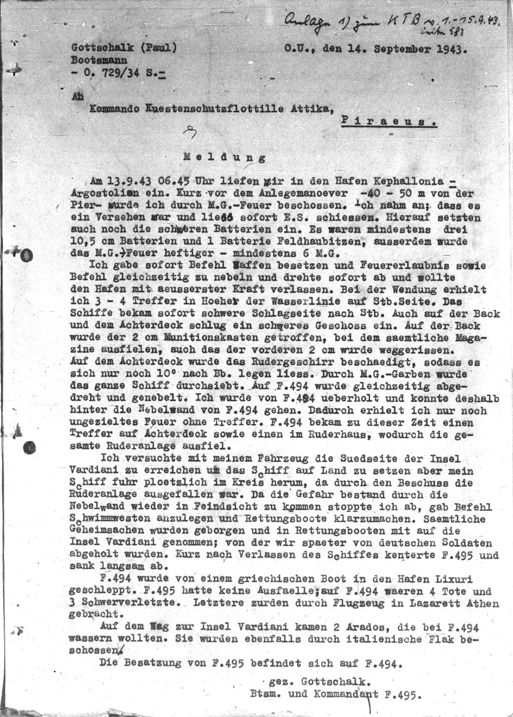 Η καταχώρηση στο πρωτότυπο: “15.9.43 Am 13/9. 0700 Uhr beschossen ital. Battr. 2 in Argostoli einlaufende mit 2-15 cm Battr. beladene eigene MFP’s, von denen einer versenkt wurde, der andere wurde mit Toten und Verwundeten nach Lixuri eingeschleppt.”