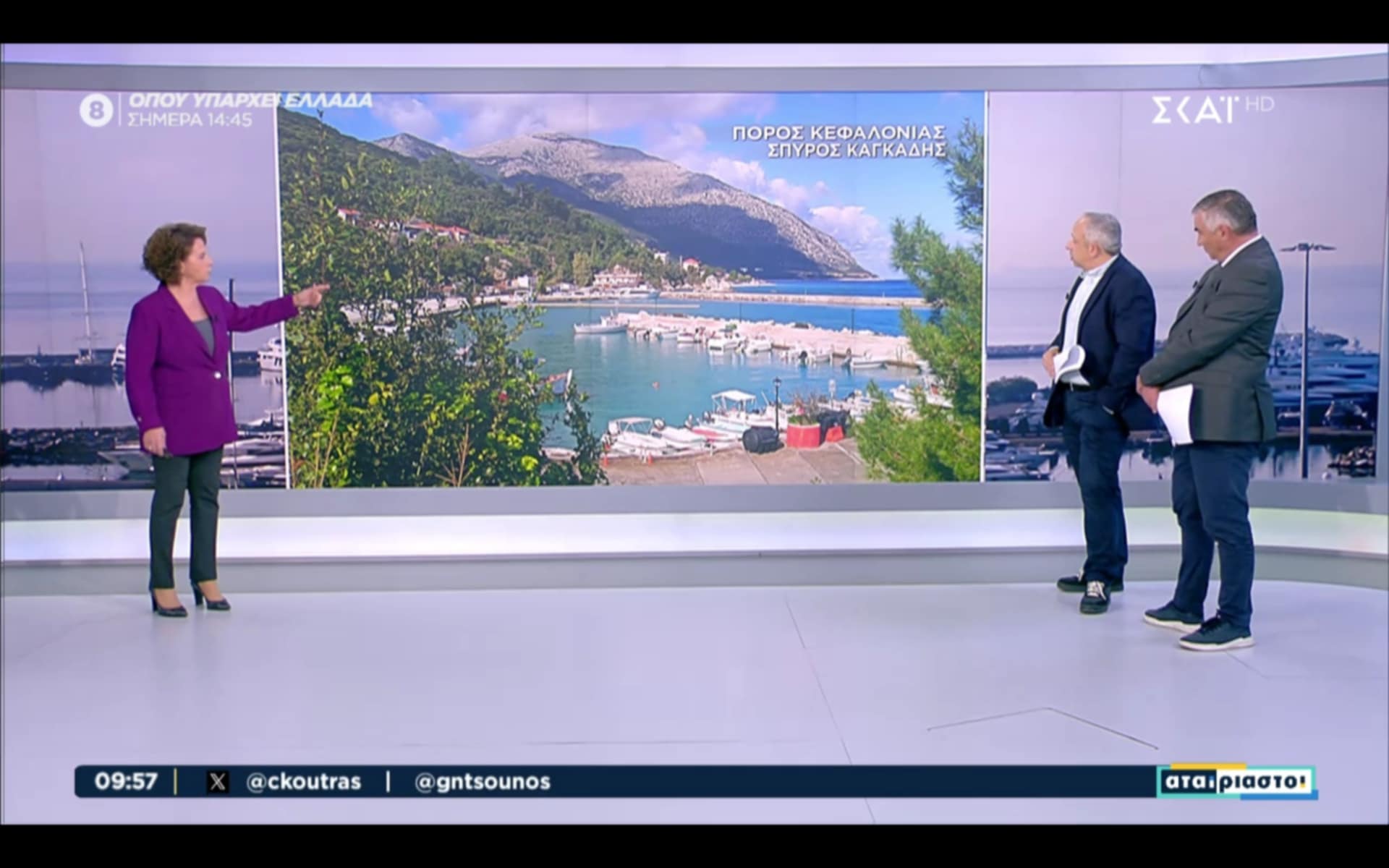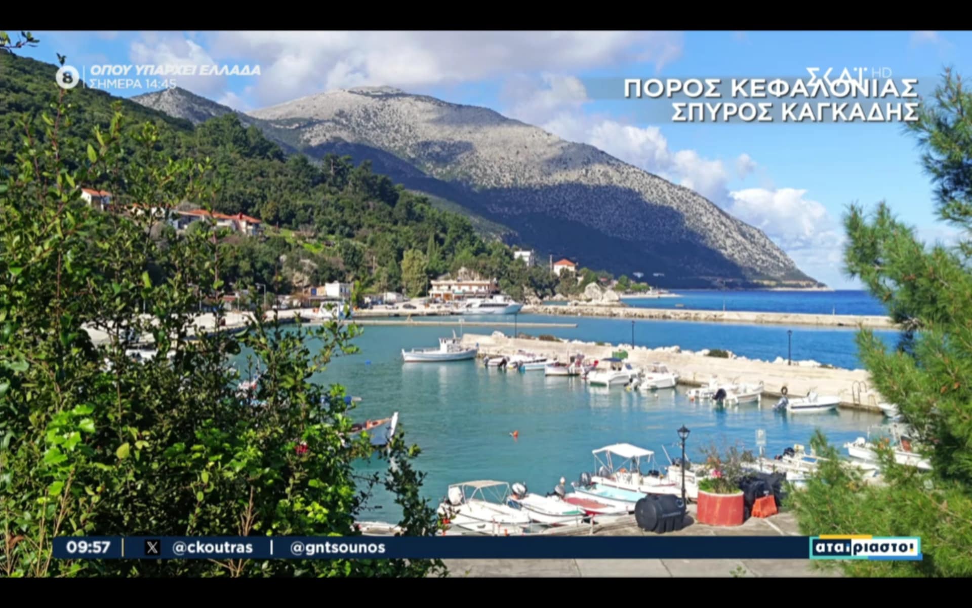 Ευχαριστούμε θερμά την αγαπημένη μας έγκυρη μετεωρολόγο του ΣΚΑΪ Χριστίνα Σούζη που νωρίτερα σήμερα στη δημοφιλή τηλεοπτική εκπομπή του σταθμού “Αταίριαστοι” με τους έγκριτους παρουσιαστές Γιάννη Ντσούνο και Χρήστο Κούτρα παρουσίασε φωτογραφία μου από το πανέμορφο και φιλόξενο λιμανάκι του Πόρου της Κεφαλονιάς μας!