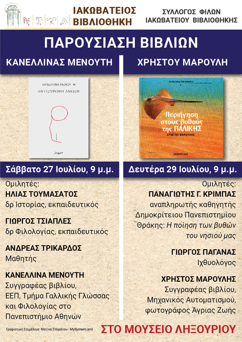 Η Ιακωβάτειος Βιβλιοθήκη σε συνεργασία με το Σύλλογο Φίλων Ιακωβατείου Βιβλιοθήκης σας καλεί στον αύλειο χώρο του Μουσείου Ληξουρίου στην παρουσίαση της ποιητικής συλλογής της Κανελλίνας Μενούτη με τίτλο «Αντίστροφη άνωση» το Σάββατο, 27 Ιουλίου 2024, 9 μ.μ.