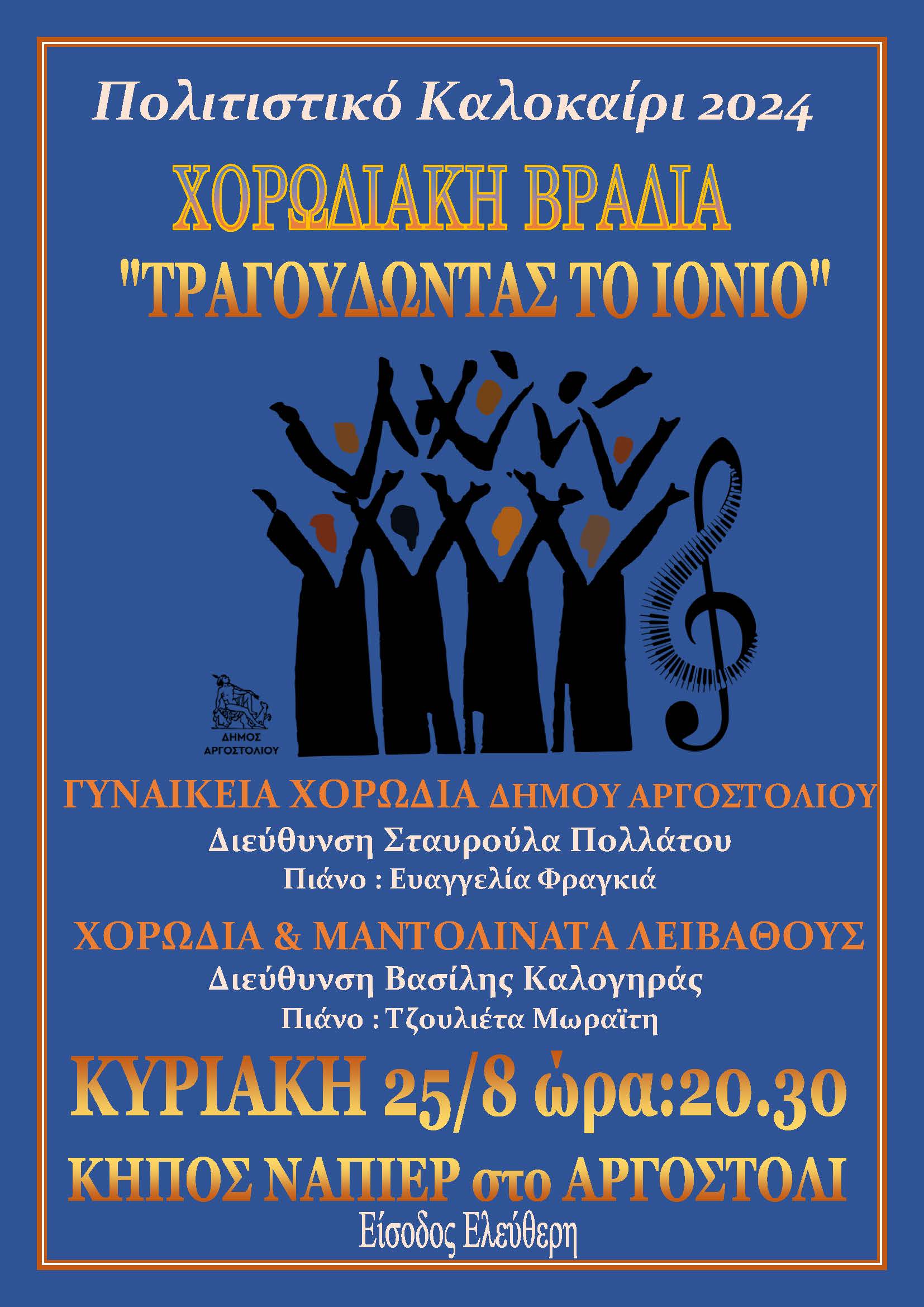 Την Κυριακή 25 Αυγούστου στον ΚΗΠΟ ΝΑΠΙΕΡ στο Αργοστόλι στις 8.30μμ, θα πραγματοποιηθεί Χορωδιακή Βραδιά με τίτλο