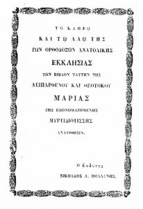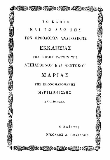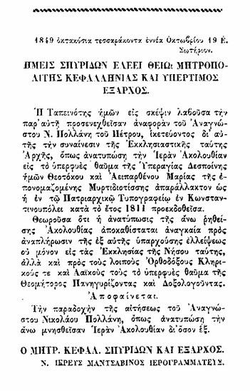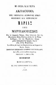 Στα 1849 ο Νικόλαος Πολλάνης  ανατύπωσε την ακολουθία της  Μυρτιδιώτισσας (του Κύκκου) , της δικής μας «Δραπανιώτισσας» στο  Τυπογραφείο του Αργοστολίου  « Η Σάλπιγξ» με τις ευλογίες του τότε μητροπολίτη Κεφαλληνίας Σπυρίδωνα Κοντομίχαλου. Δείτε και διαβάστε τις πρώτες σελίδες του βιβλίου.