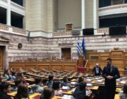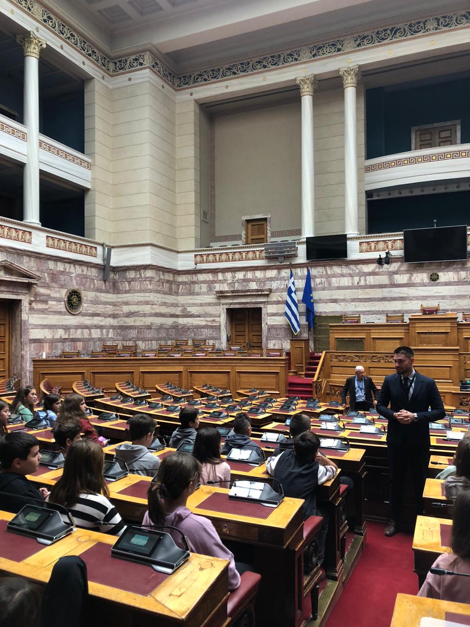 Οι μαθητές είχαν την ευκαιρία να επισκεφτούν την Αίθουσα της Ολομέλειας της Βουλής και να καθίσουν στα έδρανα των Βουλευτών, γεγονός που εντυπωσίασε τους μικρούς επισκέπτες. Ο επιστημονικός συνεργάτης μου κ. Γεώργιος Δουλδούρας καλωσόρισε εκ μέρους μου τους μαθητές και τους εκπαιδευτικούς στο Κοινοβούλιο. Οι εύστοχες ερωτήσεις και απορίες των μικρών μαθητών καθώς και το έμπρακτο ενδιαφέρον τους στάθηκαν αφορμή ώστε να τους ενημερώσει για τις υποχρεώσεις και τα καθήκοντα του Βουλευτικού αξιώματος αλλά και τον τρόπο λειτουργίας των κοινοβουλευτικών διαδικασιών.