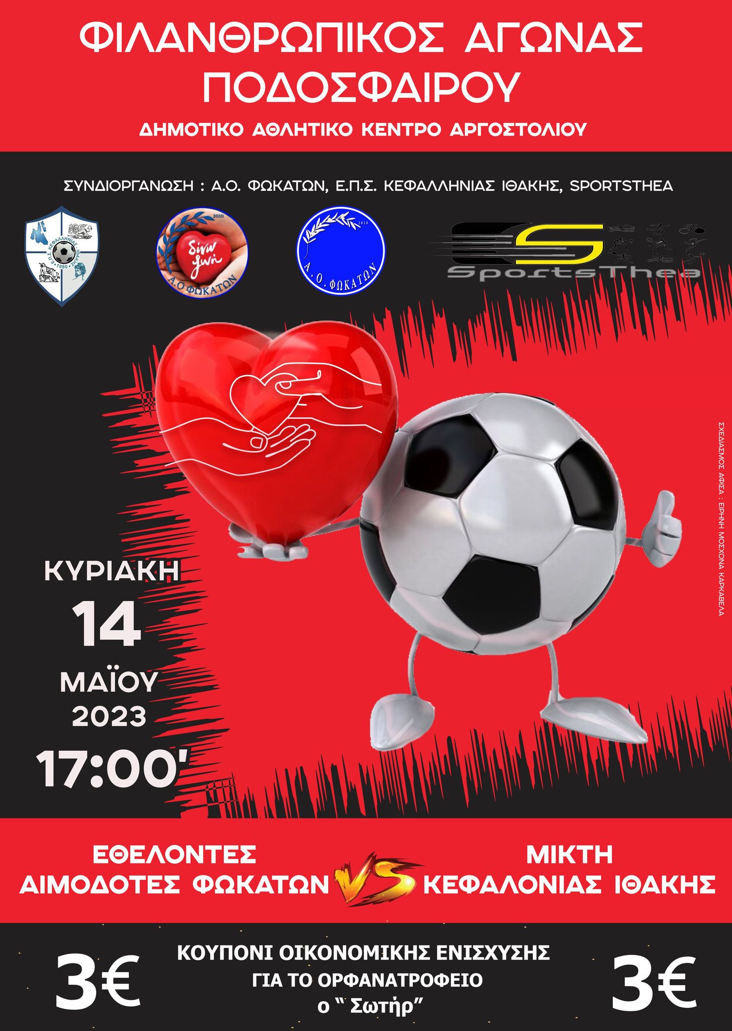 Ο Α.Ο ΦΩΚΑΤΩΝ , η ΕΠΣ ΚΕΦΑΛΛΗΝΙΑΣ -ΙΘΑΚΗΣ και το SPORTSTHEA συνδιοργανώνουν φιλανθρωπικό αγώνα ποδοσφαίρου που θα διεξαχθεί την 14 Μαίου ημέρα Κυριακή και ώρα 17.00 στο ΔΑΚ Αργοστολίου μεταξύ των ΕΘΕΛΟΝΤΩΝ ΑΙΜΟΔΟΤΩΝ ΑΟ ΦΩΚΑΤΩΝ εναντίον της ΜΙΚΤΗΣ ΚΕΦΑΛΟΝΙΑΣ ΚΑΙ ΙΘΑΚΗΣ.