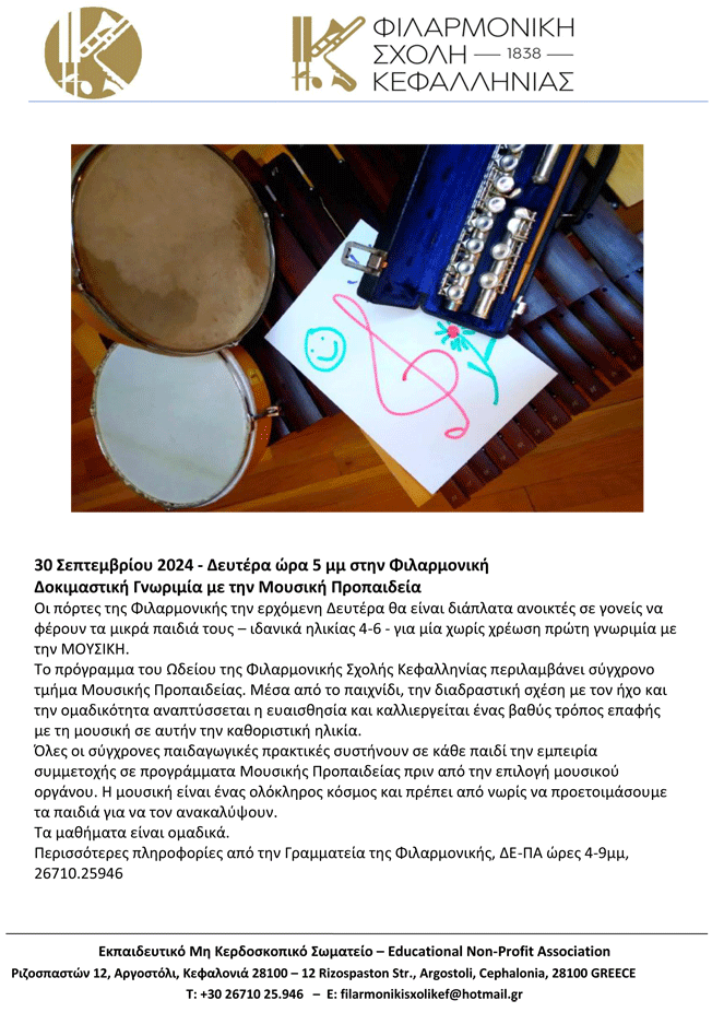 Φιλαρμονική Σχολή Κεφαλληνίας: Δοκιμαστική Γνωριμία με τη Μουσική Προπαίδεια.