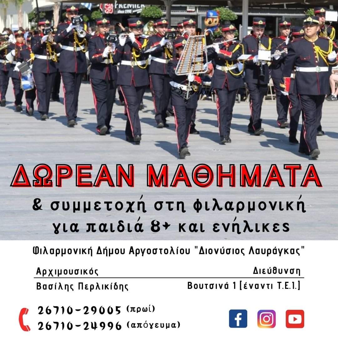Στη Δημοτική Φιλαρμονική Αργοστολίου “Διονύσιος Λαυράγκας” παρέχεται συνολική μουσική εκπαίδευση, θεωρητικών και μουσικού οργάνου, σε μικρά παιδιά από 8 ετών και άνω, σε εφήβους, φοιτητές και ενήλικες κάθε ηλικίας!