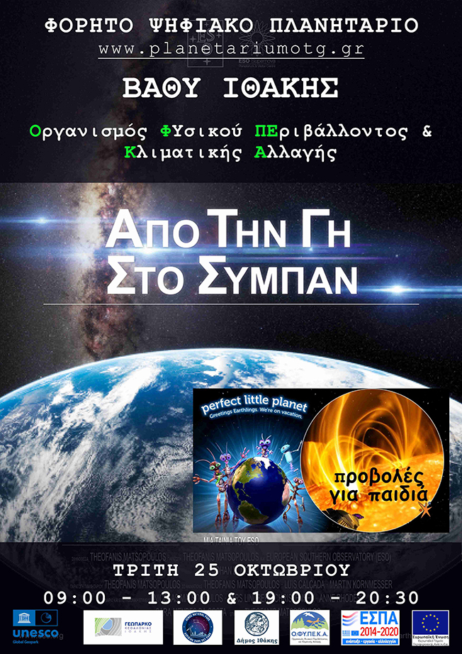 Το Φορητό Ψηφιακό Πλανητάριο, μοναδικό στο είδος του – μια ειδική ημιμόνιμη φορητή κατασκευή σταθερού θόλου με καρέκλες για τους θεατές, ταξιδεύει στην Ιθάκη προσφέροντας μια μοναδική οπτικοακουστική διδακτική εμπειρία. Κυρίαρχο χαρακτηριστικό του είναι η ημισφαιρική οθόνη προβολής διαμέτρου 6 μέτρων με επιφάνεια εμβαδού 57 τετραγωνικών μέτρων! Μπορεί να εγκατασταθεί τόσο σε εσωτερικό όσο και σε εξωτερικό χώρο, δεν έχει πρόβλημα με τη βροχή και ο χώρος είναι κλιματιζόμενος, με θέρμανση τον χειμώνα και ψύξη το καλοκαίρι. Το Φορητό Ψηφιακό Πλανητάριο εμπνέει και εκπαιδεύει ανθρώπους όλων των ηλικιών. Από παιδιά του Νηπιαγωγείου μέχρι την Τρίτη ηλικία. Δείχνοντας τις συναρπαστικές ανακαλύψεις στην εξερεύνηση του διαστήματος, συμβάλλει στην κατανόηση του κόσμου γύρω μας, ανοίγει τους ορίζοντες των θεατών, εμπνέει και εκπαιδεύει για όσα μας περιβάλλουν, για την ίδια τη Γη και τη θέση μας στο σύμπαν. Μία εκδήλωση αστρονομίας περιλαμβάνει προβολές μέσα στο Φορητό Ψηφιακό Πλανητάριο και παράλληλα παρατήρηση με τηλεσκόπιο, του Ηλίου με ειδικά φίλτρα την ημέρα ή του έναστρου ουρανού το βράδυ (η παρατήρηση εφόσον το επιτρέπουν οι καιρικές συνθήκες).