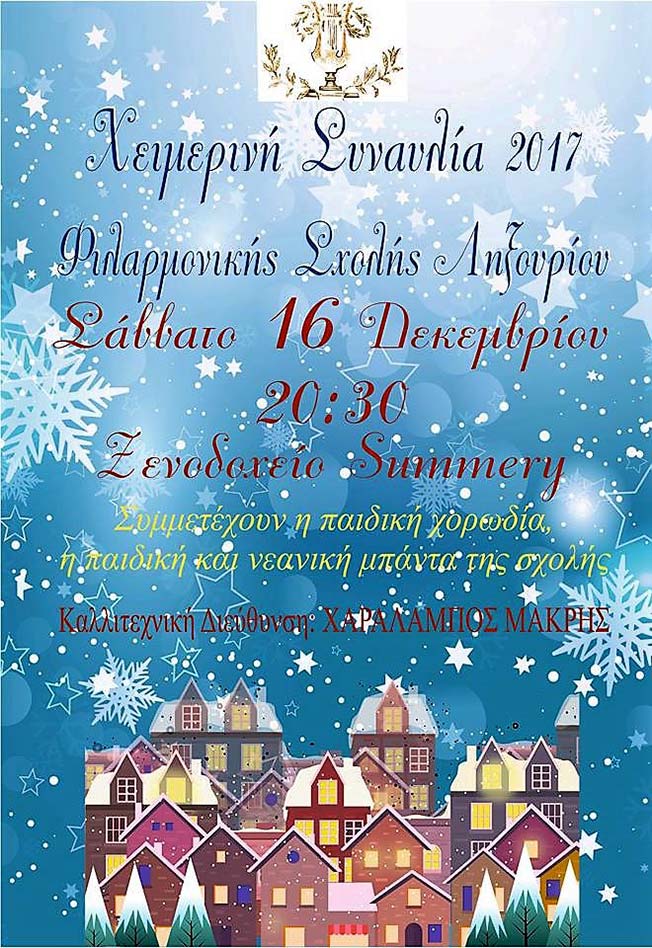 Η μεγάλη χειμερινή συναυλία των μαθητών της Φιλαρμονικής Σχολής Ληξουρίου. Συμμετέχουν η παιδική χορωδία, η παιδική και νεανική μπάντα. Σαββάτο 16 Δεκεμβρίου 2017, ώρα 20:30 στην αίθουσα του ξενοδοχείου Summery!
