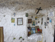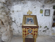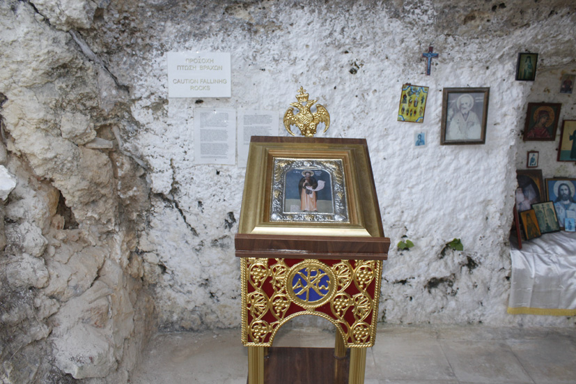 Ζήτησε το ναό του σπηλαίου της Αγίας Παρασκευής στα Λέπεδα από τους κτητορικούς αδελφούς  και αφού έλαβε την άδεια γκρέμισε τα παλιά  μικρά χαμόσπιτα και ανήγειρε εκ θεμελίων  καινούρια, ως παλάτι περιγραφόμενα με μια λέξη στο χειρόγραφο. Διαίρεσε το επάνω μέρος του κτίσματος  αυτού,  σε επτά κελιά  για τις  μοναχές και κατέστησε έτσι ικανό ασκητικό κοινόβιο. Δεν σταμάτησε όμως και έκτισε και δεύτερο παλάτι δίπλα σε αυτό,  «…κολλητόν εις το πλάγιον της άκρας του πρώτου…»  όπως γράφεται σε αυτή τη χειρόγραφη βιογραφία του . Κατασκεύασε γι αυτόν  ένα μικρόν οικίσκο, κοντά στην εκκλησία,  « ο οποίος δεν ήταν μεγαλύτερος κατά το πλάτος  και το μάκρος  από μία τετραγωνική οργιά, το δε ύψος ως επτά πόδας, και εκεί μέσα εστέκετο νυχθημερόν και εις όλας τας ώρας του έτους όταν ευρίσκετο εις το Μοναστήρι, έχων δια κλίνην δυο μόνας σανίδας,  επάνω σε δυο πέτρας και τον άνω ειρημένων τάπητα».