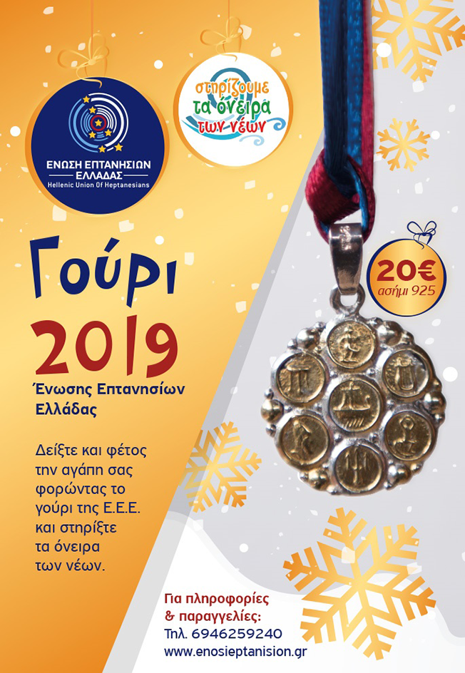Η Ένωση Επτανησίων Ελλάδας για 3η χρονιά συνεχίζει τη δράση κοινωνικής αλληλεγγύης «Στηρίζουμε τα όνειρα των νέων» και ανακοινώνει τη κυκλοφορία γουριού για το έτος 2019. Το γούρι απεικονίζει τους επτά θυρεούς των Επτανήσων και έχει φιλοτεχνηθεί από τον αργυροχρυσοχόο Πέτρο Καρύδη σε ασήμι 925ο επιχρυσωμένο με χρυσό 24 καρατίων, αξίας 20,00€.