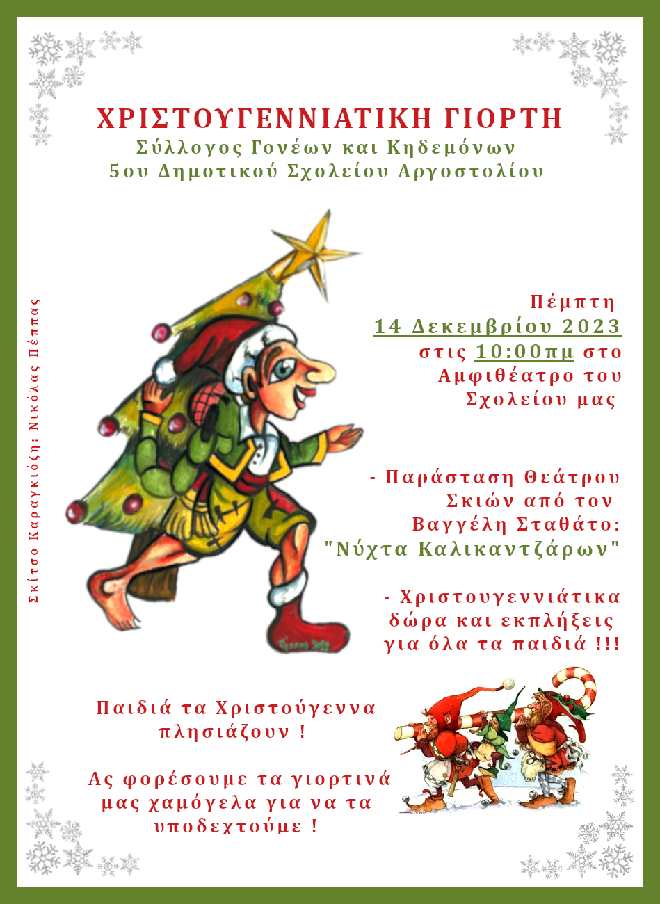 Πραγματοποιήθηκε την Πέμπτη 14 Δεκέμβρη 2023 η προγραμματισμένη χριστουγεννιάτικη γιορτή του Συλλόγου μας για τα παιδιά του σχολείου μας. Η γιορτή περιλάμβανε παράσταση Θεάτρου Σκιών από τον Βαγγέλη Σταθάτο, μπουφέ με εορταστικά εδέσματα καθώς και δώρα και εκπλήξεις για τα παιδιά.