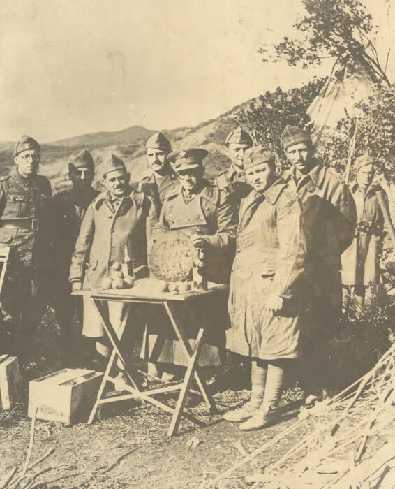 Πρωτοχρονιά του 1941 στο μέτωπο, κοπή της βασιλόπιτας. Είναι χαρακτηριστικό ότι σε όλες τις εκστρατείες του Ελληνικού Στρατού τα έθιμα τηρούνταν.