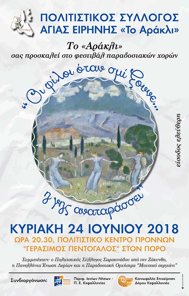 Ο Πολιτιστικός σύλλογος “Αράκλι”” σας προσκαλεί στο φεστιβάλ παραδοσιακών χορων με τίτλο “Οι φίλοι όταν σμίξουνε… η γης αναταράσσει” την Κυριακή 24 Ιουνίου 2018 και ώρα 8:30 μ.μ. στον Πόρο Κεφαλονιάς προκειμένου να παρακολουθείσετε τα τμήματα παραδοσιακού χορού μας με χοροδιδάσκαλο τον κ. Μεγαδούκα Χρήστο καθώς και τους φιλοξενούμενους Συλλόγους Σαρακινάδου Ζακύνθου και Πανελλήνιας Ένωσης Λερίων οι οποίοι θα μας ταξιδέψουν μουσικά σε όλο τον ελλαδικό χώρο καταδεικνύοντας τη δύναμη της φιλίας και πώς αυτή αναπτύσσεται μέσα από το χορό.