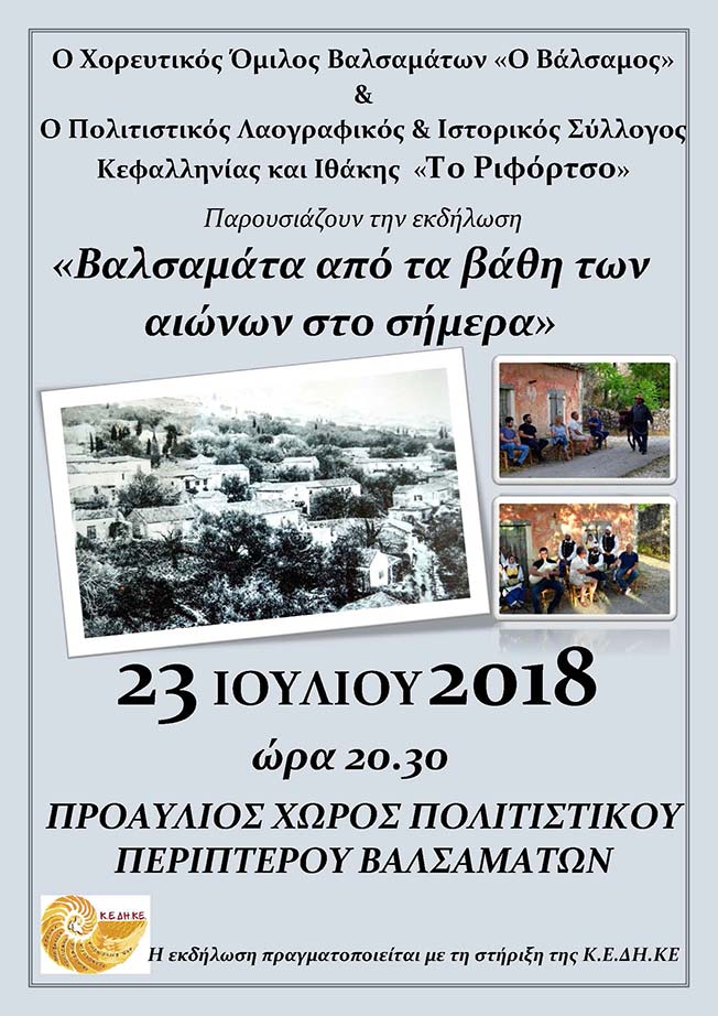 Ο Χορευτικός Όμιλος Βαλσαμάτων Κεφαλονιάς «Ο Βάλσαμος», διοργανώνει την εκδήλωση «Βαλσαμάτα από τα βάθη των αιώνων στο σήμερα» τη Δευτέρα 23 Ιουλίου 2018 και ώρα 20.30 στον προαύλιο χώρο του πολιτιστικού περίπτερου Βαλσαμάτων, σε συνεργασία με τον Πολιτιστικό Λαογραφικό & Ιστορικό Σύλλογο Κεφαλληνίας και Ιθάκης «Το Ριφόρτσο» θα παρουσιαστούν άγνωστα στοιχεία μέσα από ομιλίες και θα προβληθεί ένα ντοκιμαντέρ που θα μας ταξιδέψει σε άλλες εποχές, όταν το παλιό χωριό στα Βαλσαμάτα ήταν χτισμένο στους πρόποδες του Αίνου.