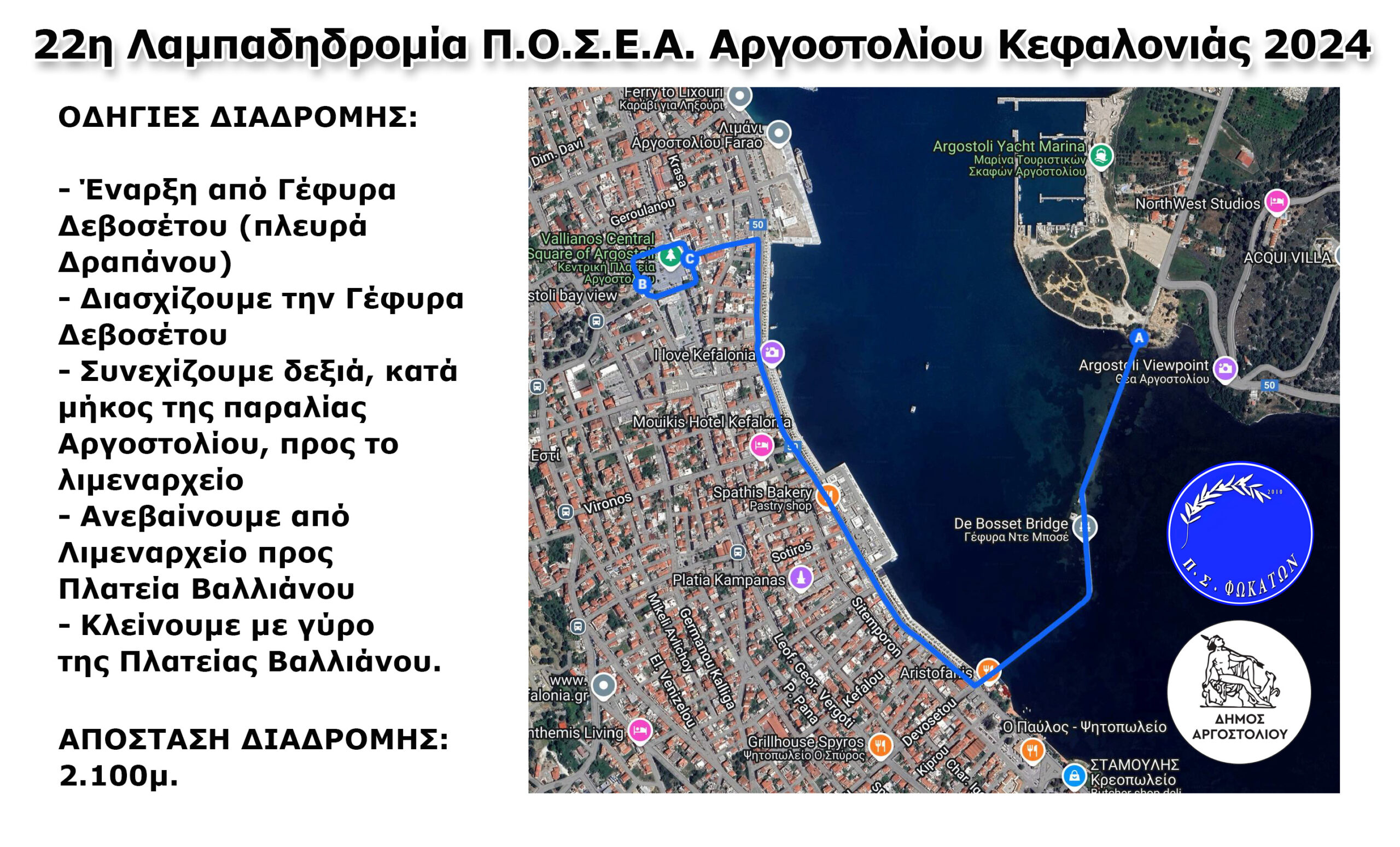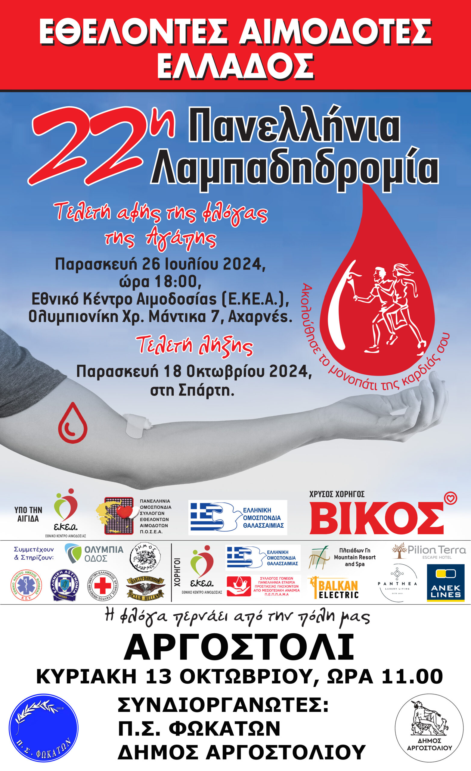 Στα πλαίσια της 22ης Πανελλήνιας Λαμπαδηδρομίας εθελοντών αιμοδοτών Ελλάδος που συνδιοργανώνουν η Π.Ο.Ε.Σ.Α., ο Π.Σ. Φωκάτων και ο Δήμος Αργοστολίου για πρώτη φορά στο νησί μας, σας καλούμε στην τελετή της φλόγας της αγάπης με την διεξαγωγή της Λαμπαδηδρομίας στην πόλη μας το Αργοστόλι την Κυριακή 13 Οκτωβρίου και ώρα 11.00μμ.