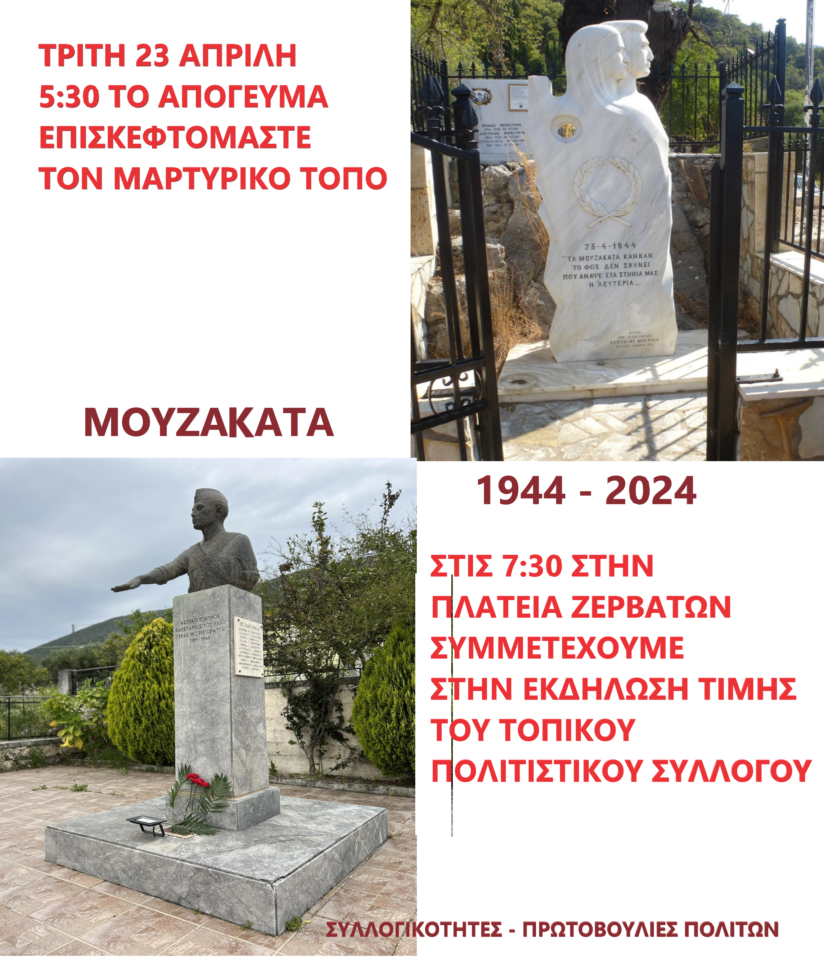 23 Απριλίου 1944 τα μαρτυρικά Μουζάκατα, …… Κάστρο του εθνικοαπελευθερωτικού και αντιφασιστικού κινήματος του ΕΑΜ, έδρα του ΕΛΑΣ της Κεφαλλονιάς με επικεφαλής τον Γεράσιμο Γρηγοράτο- Αστραπόγιαννο,…. έγραψαν λαμπρές σελίδες στην ιστορία της αντίστασης στο νησί των μεγάλων επαναστατικών παραδόσεων,… των ριζοσπαστών,… του Μαρίνου Αντύπα… και του Ρόδου Χοϊδά,…