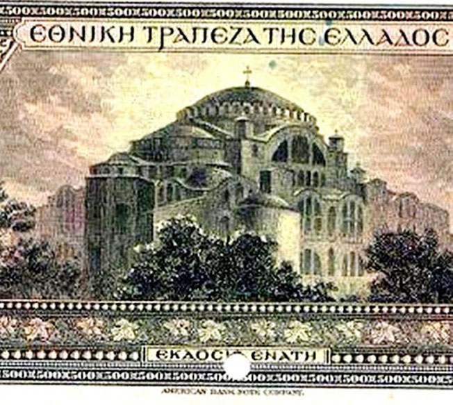 Η Αγία Σοφία χωρίς μιναρέδες και με χριστιανικό σταυρό στον τρούλο, σε ελληνικό χαρτονόμισμα του 1923.