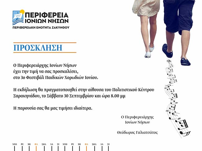 Η Περιφέρεια Ιονίων Νήσων διοργανώνει το 3ο Φεστιβάλ Παιδικών Χορωδιών Ιονίων Νήσων. Παιδικές χορωδίες από την Κέρκυρα, τους Παξούς, τη Λευκάδα, την Κεφαλονιά και τη Ζάκυνθο ενώνουν τις φωνές τους για να προσφέρουν ένα μοναδικό μουσικό βράδυ, το Σάββατο 30 Σεπτεμβρίου 2017 και ώρα 8μ.μ. στο Πολιτιστικό Κέντρο Σαρακηνάδου, στη Ζάκυνθο.