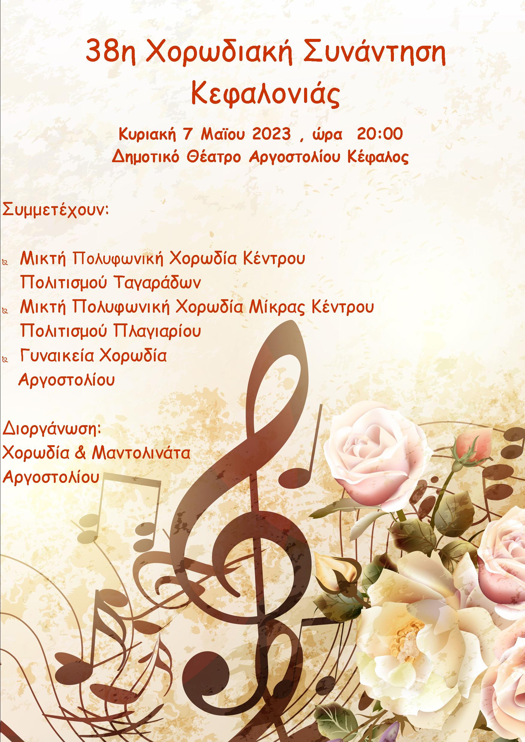 Η ΧΟΡΩΔΙΑ & ΜΑΝΤΟΛΙΝΑΤΑ ΑΡΓΟΣΤΟΛΙΟΥ , αρχίζει την φετινή της παρουσία στα μουσικά – χορωδιακά δρώμενα του νησιού διοργανώνει την Κυριακή 7 Μαΐου 2023 , την ανοιξιάτικη ΧΟΡΩΔΙΑΚΗ ΣΥΝΑΝΤΗΣΗ ΚΕΦΑΛΟΝΙΑΣ .