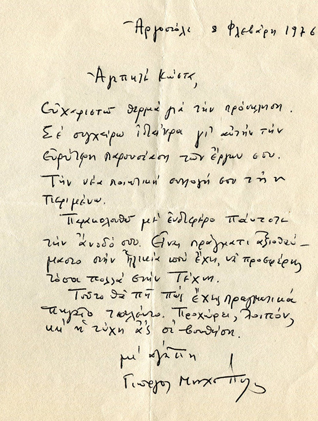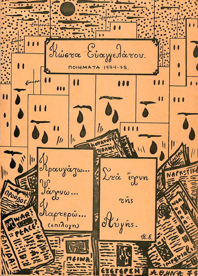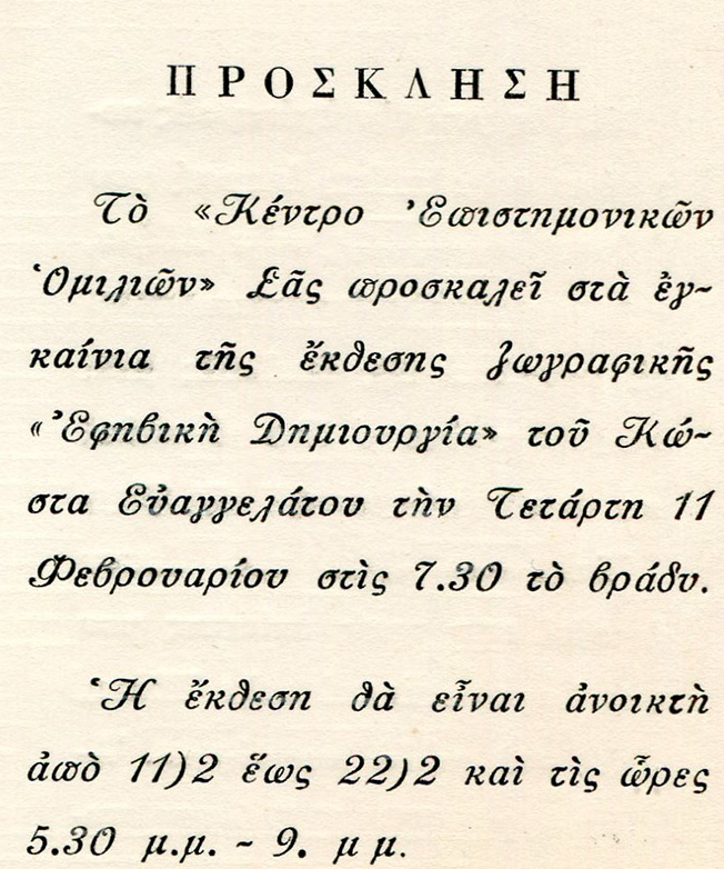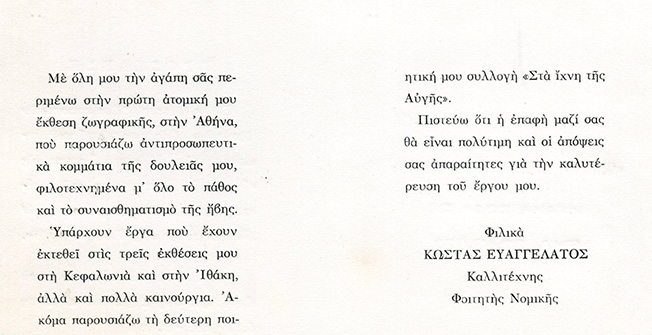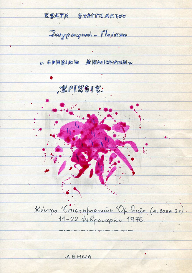 Η πρώτη μου ατομική έκθεση στην Αθήνα εγκαινιάστηκε στις 11 Φεβρ. 1976, με παράλληλη παρουσίαση της επανέκδοσης της ποιητικής μου συλλογής “Ποιήματα 1973-75” με την προσθήκη της νέας ενότητας “Στα Ίχνη της Αυγής”.