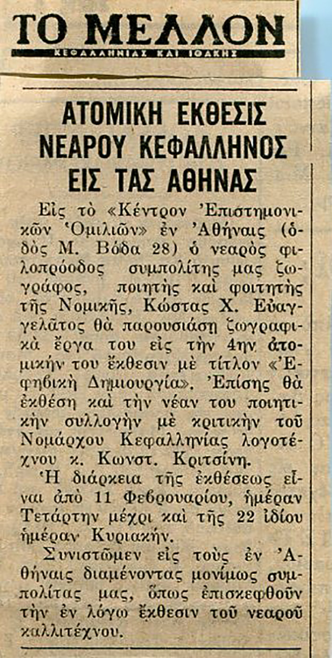 Βέβαια είχα στο ενεργητικό τις επιτυχίες των εκθέσεων, που είχαν ακουστεί και πέραν του νησιού καθώς και την κυκλοφορία της πρώτης συλλογής ποιημάτων μου από έγκυρο εκδοτικό οίκο, η οποία είχε λάβει επαινετικές κριτικές από ειδικούς και κοινό. Είχα επίσης γνωρίσει από κοντά τον μεγάλο ποιητή και στοχαστή Οδυσσέα Ελύτη, έχοντας ζωγραφίσει την “Μαρίνα των Βράχων” και την αξιοθαύμαστη Ιωάννα Κων.Τσάτσου, αδελφή του Σεφέρη, όμως γνώριζα πολύ καλά ότι η ατομική έκθεση στην Αθήνα, ειδικά τότε που τα κριτήρια ήταν μόνο αυστηρά, θάταν μεγάλο ρίσκο για το όνομα που είχα αρχίσει να διαμορφώνω θετικά. Η δυνατότητα μου δόθηκε στο Κέντρο Επιστημονικών Ομιλιών, μετέπειτα Κ.Ε.Ο. Αθηνών, στο επιβλητικό παλαιό κτίριο της οδού Μιχαήλ Βόδα, τότε που η περιοχή άκμαζε καλλιτεχνικά και πνευματικά. Επιστράτευσα κυριολεκτικά όσες δυνάμεις είχα για την προετοιμασία και ακολούθησα τη λογική στησίματος των ζωγραφιών μου κατά ενότητες. Συμβολικά σχέδια, Ερειπιογραφίες, Συνθέσεις. Η ποιητική συλλογή μου, επίσης άψογα εκτυπωμένη, με πρόλογο του συγγραφέα Κώστα Κριτσίνη, Νομάρχη Κεφαλονιάς, απάρτιζαν ένα ενδιαφέρον σύνολο, που σε συνδυασμό με τη νεαρή μου ηλικία, ευελπιστούσα να συγκινήσει τους καλλιτέχνες, λογοτέχνες, συμφοιτητές, δασκάλους, Κεφαλονίτες της Αθήνας που την ανέμεναν.