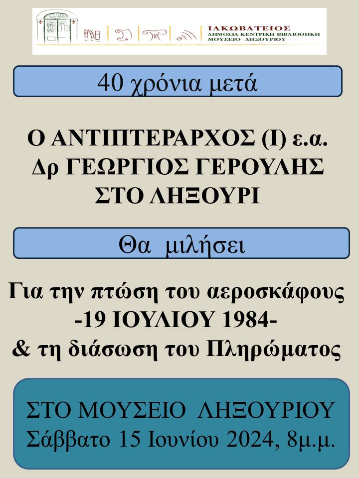 Σας προσκαλούμε, λοιπόν, το Σάββατο, 15 Ιουνίου 2024 και ώρα 8 μ.μ., στον αύλειο χώρο του Μουσείου Ληξουρίου, προκειμένου να ακούσουμε και να συζητήσουμε με τον αντιπτέραρχο (Ι) ε.α. δρα Γεώργιο Γερούλη.