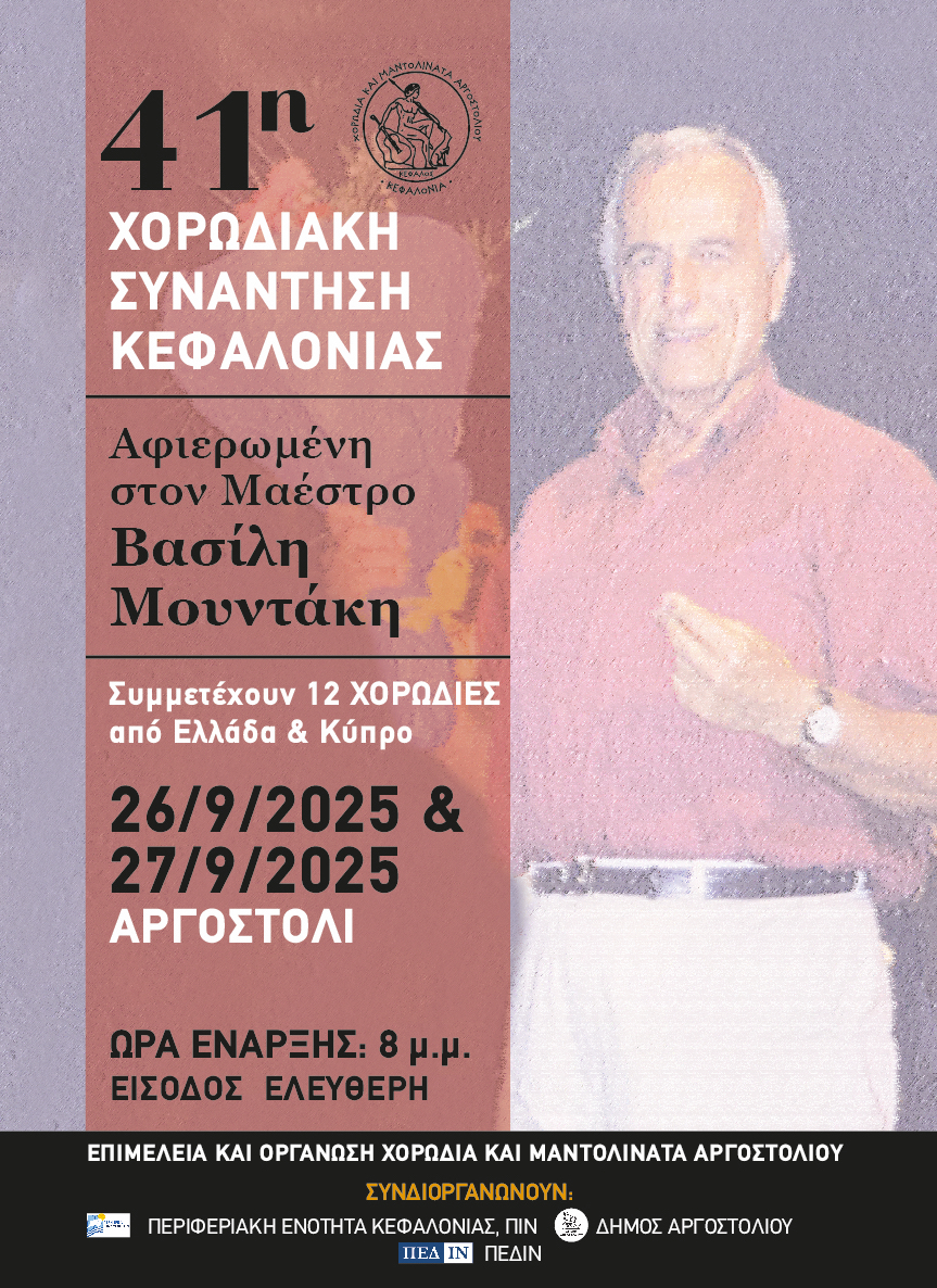 Η 41η ΧΟΡΩΔΙΑΚΗ ΣΥΝΑΝΤΗΣΗ ΚΕΦΑΛΟΝΙΑΣ είναι μια συνδιοργάνωση της Περ. Εν. Κεφαλονιάς της ΠΙΝ. , του Δήμου Αργοστολίου και της ΠΕΔΙΝ.