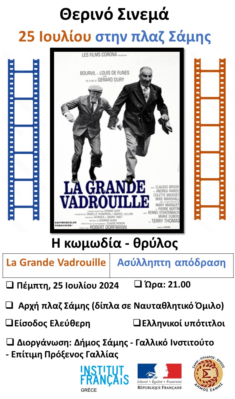 Ο Δήμος Σάμης σε συνεργασία με το Γαλλικό Ινστιτούτο και την Επίτιμη Πρόξενο της Γαλλίας διοργανώνουν βραδιά θερινού κινηματογράφου την Πέμπτη 25 Ιουλίου 2024 στην πλαζ της Σάμης στις 21.00.