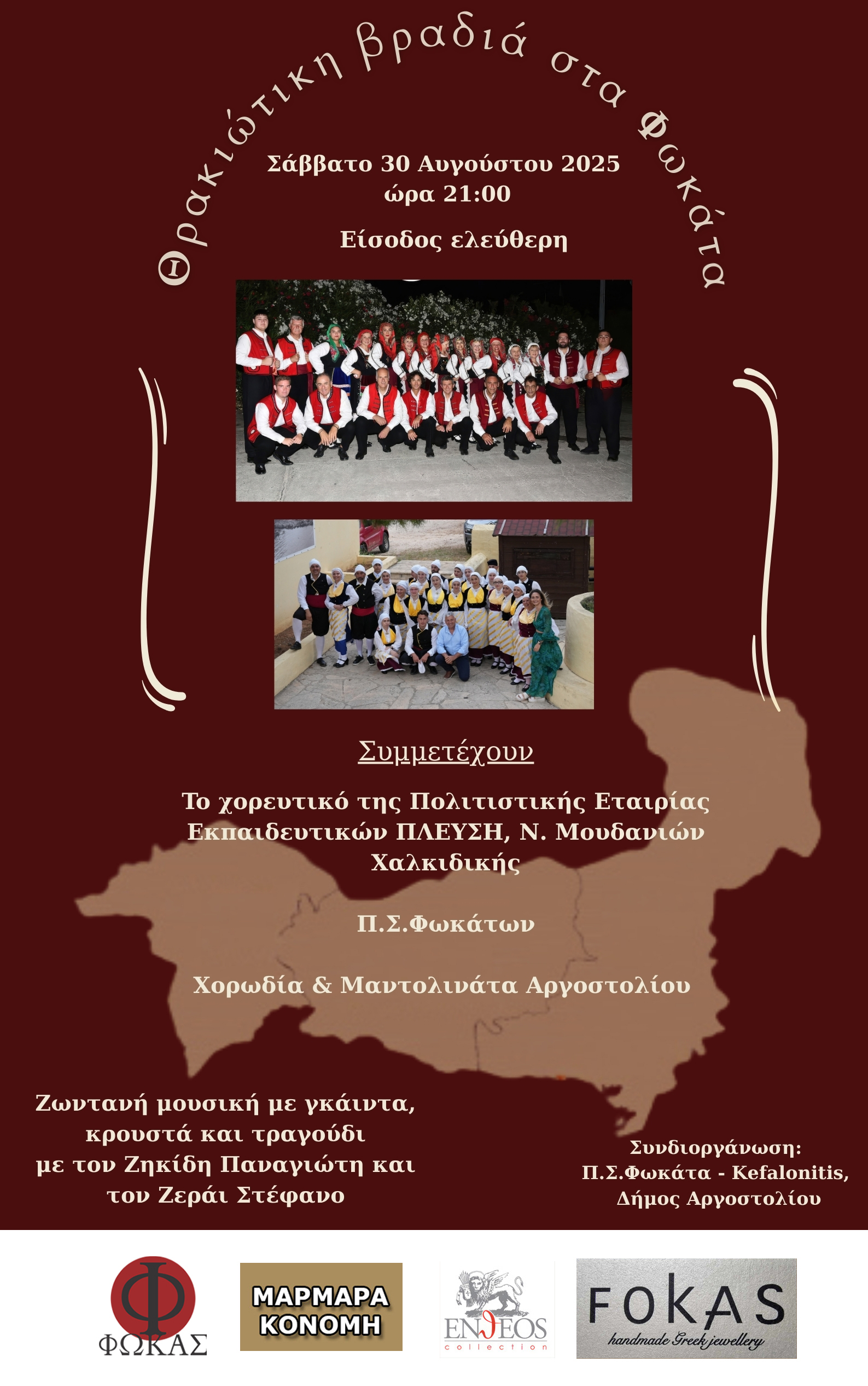 Σας προσκαλούμε το Σάββατο 30  Αυγούστου 2025 και ώρα 21.00 στην «Θρακιώτικη  Βραδιά στα Φωκάτα» . Μια μοναδική βραδιά γεμάτη με γκάιντα και κρουστά, και χορούς από την Θράκη.