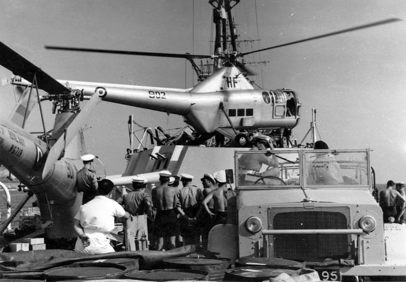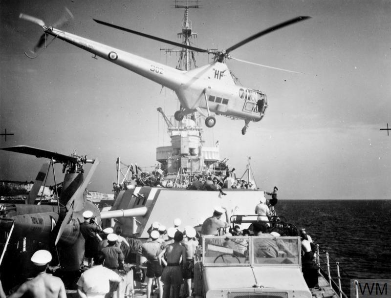 - Το ένα από τα δύο ελικόπτερα απονηώνεται από το καταδρομικό “HMS Bermuda”, Ζάκυνθος 15-8-1953 (Imperial War Museum IWM A32665)