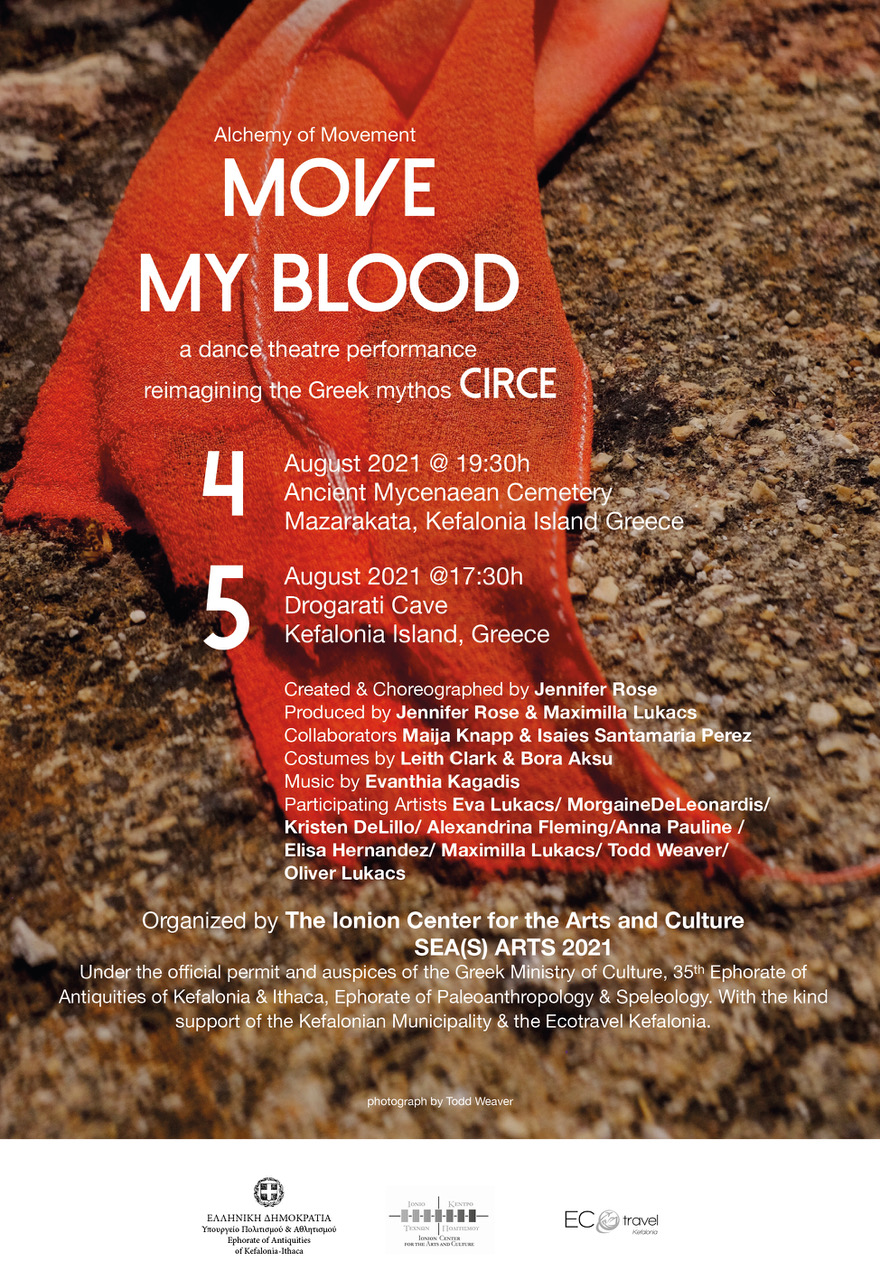 To ”Alchemy of Movement -MOVE MY BLOOD ’’ υποστηρίζεται από το Eλληνικό Υπουργείο Πολιτισμού, την Εφορεία Αρχαιοτήτων Κεφαλονιάς και Ιθάκης και την Εφορεία Παλαιοανθρωπολογίας και Σπηλαιολογίας, Τμήμα Αρχαιοτήτων των Προϊστορικών και Ιστορικών Περιόδων.