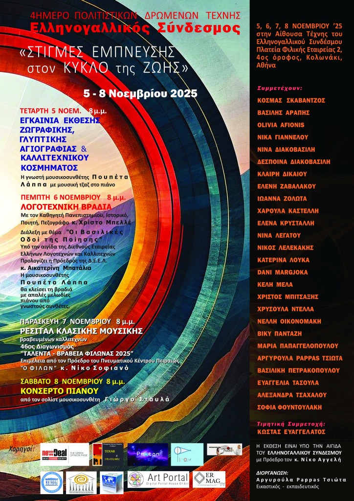 Την Τετάρτη 5 Νοεμβρίου 2025, 8 μ.μ. συμμετέχει, ως ο τιμώμενος καλλιτέχνης, στα 4ήμερα Δρώμενα Τέχνης, με τίτλο: “Στιγμές έμπνευσης στον κύκλο της ζωής” που διοργανώνει η εικαστικός-εκπαιδευτικός κ. Ρούλα Πάππας-Τσιώτα, με την αιγίδα του Ελληνογαλλικού Συνδέσμου και του Προέδρου του Δρ. Νίκου Αγγελή στην Αίθουσα τέχνης του Συλλόγου. Διάρκεια: 5-8 Νοεμβρίου 2025. Πλατεία Φιλικής Εταιρείας 2, 4ος όροφος, Κολωνάκι. Είσοδος ελεύθερη.