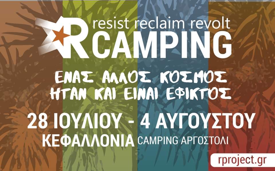 Tο Resist.Reclaim.Revolt camping (R-camping) και το rproject.gr θα βρίσκονται από τις 28 Ιουλίου μέχρι τις 4 Αυγούστου, στο camping «Αργοστόλι», στην πανέμορφη Κεφαλονιά.