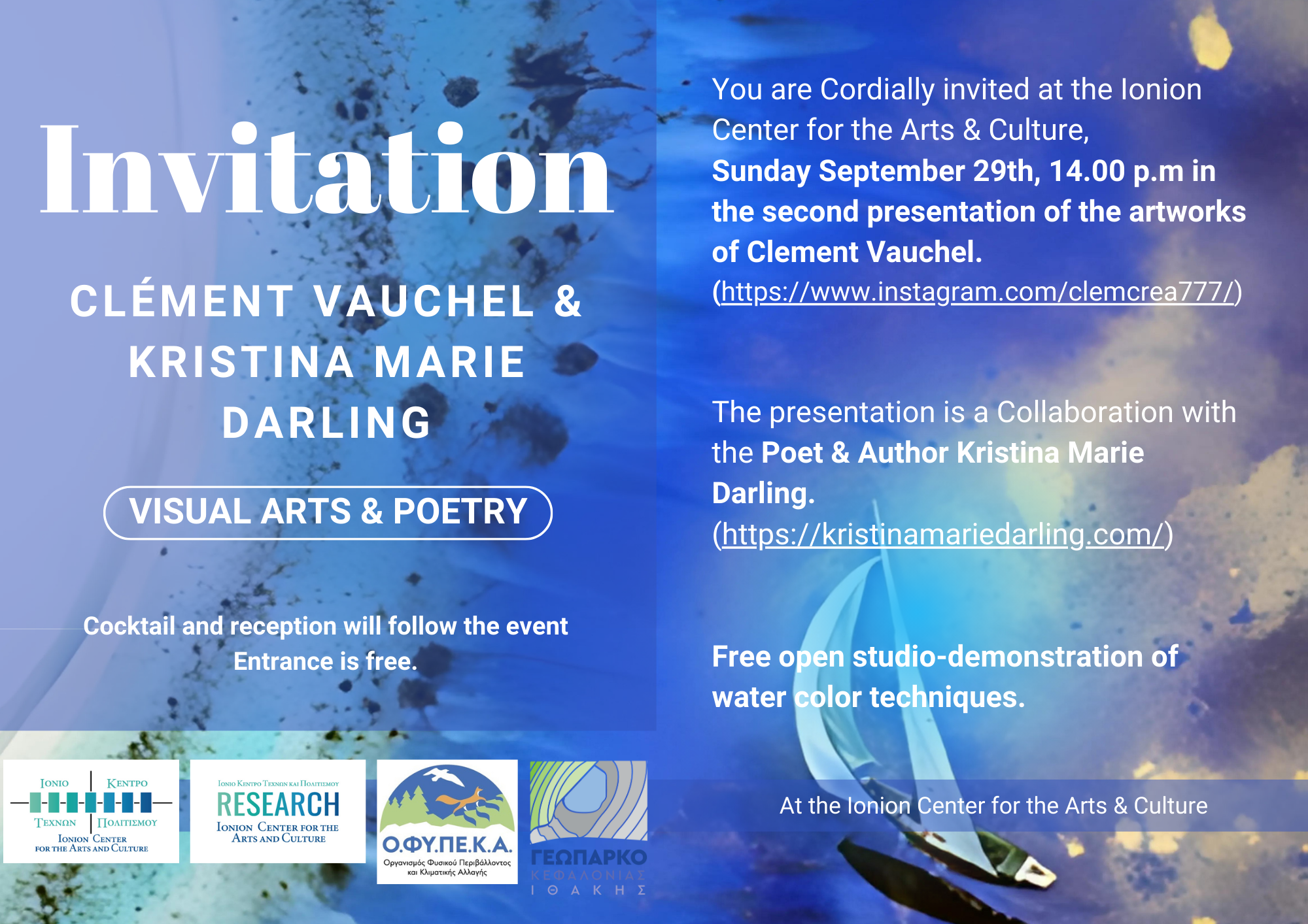 Είστε εγκάρδια προσκεκλημένοι στο Ιόνιο Κέντρο Τεχνών & Πολιτισμού την Κυριακή 29 Σεπτεμβρίου, 14.00 μ.μ, στη δεύτερη παρουσίαση των έργων τέχνης του Clement Vauchel με τίτλο ”A GIFT OF ART FOR THE OCEAN”( https://www.instagram.com/clemcrea777/).