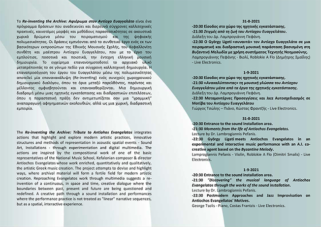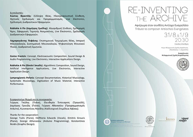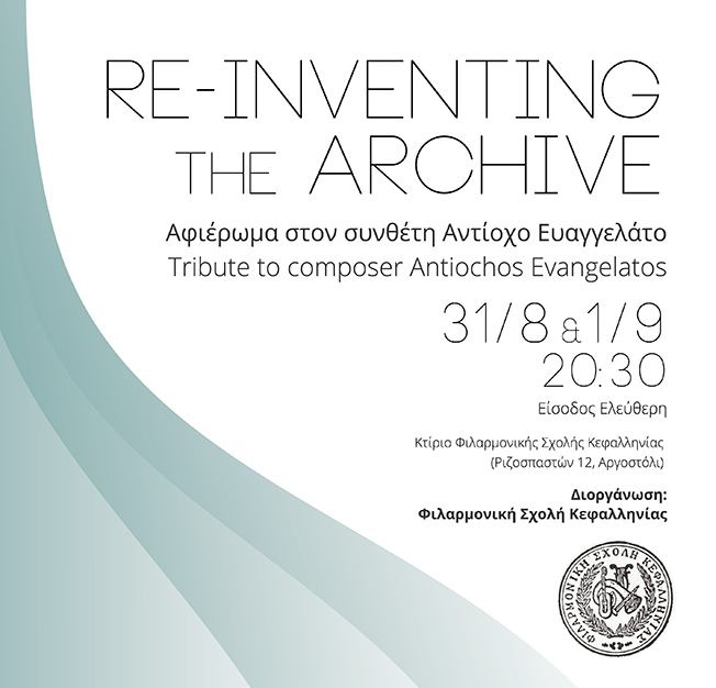 Το Re–inventing the Archive: Αφιέρωμα στον Αντίοχο Ευαγγελάτο είναι ένα πρόγραμμα δράσεων που αναδεικνύει και διερευνά σύγχρονες καλλιτεχνικές πρακτικές, καινοτόμες μορφές και μεθόδους παραστατικότητας σε ακουστικά χωρικά δρώμενα μέσω του πειραματισμού και της ψηφιακής πολυμεσικότητας. Οι δράσεις εμπνέονται από το συνθετικό έργο ενός εκ των βασικότερων εκπροσώπων της Εθνικής Μουσικής Σχολής, του Κεφαλλονίτη συνθέτη και μαέστρου Αντίοχου Ευαγγελάτου, που με το έργο του εμπλούτισε, ποσοτικά και ποιοτικά, την έντεχνη ελληνική μουσική δημιουργία. Το εγχείρημα επανανοημοτοδοτεί το αρχειακό υλικό μετατρέποντάς το σε γόνιμο πεδίο για σύγχρονη καλλιτεχνική δημιουργία. Η επαναπροσέγγιση του έργου του Ευαγγελάτου μέσω της πολυμεσικότητας αποτελεί μία επανανακάλυψη (Re-inventing) ενός συνεχούς χωροχρονικού δημιουργικού διαλόγου, όπου τα όρια μεταξύ παρελθόντος, παρόντος και μέλλοντος αμφισβητούνται και επανακαθορίζονται. Μια δημιουργική διαδρομή μέσω μιας ηχητικής εγκατάστασης και διαδραστικών επιτελέσεων, όπου η παραστατική πράξη δεν αντιμετωπίζεται σαν μια “γραμμική” αναπαραγωγή αφηγηματικών ακολουθιών, αλλά ως μια χωρική, διαδραστική εμπειρία.